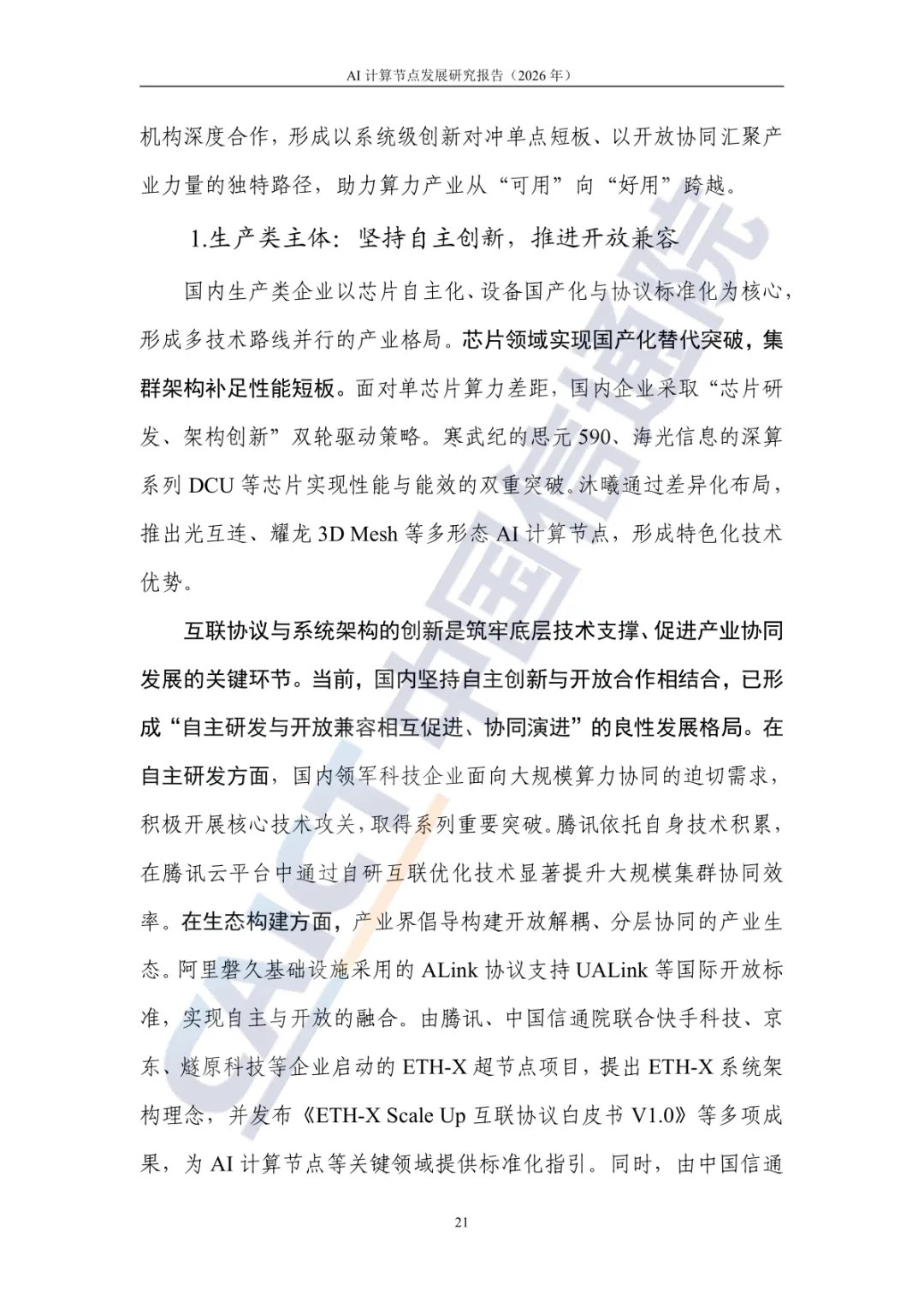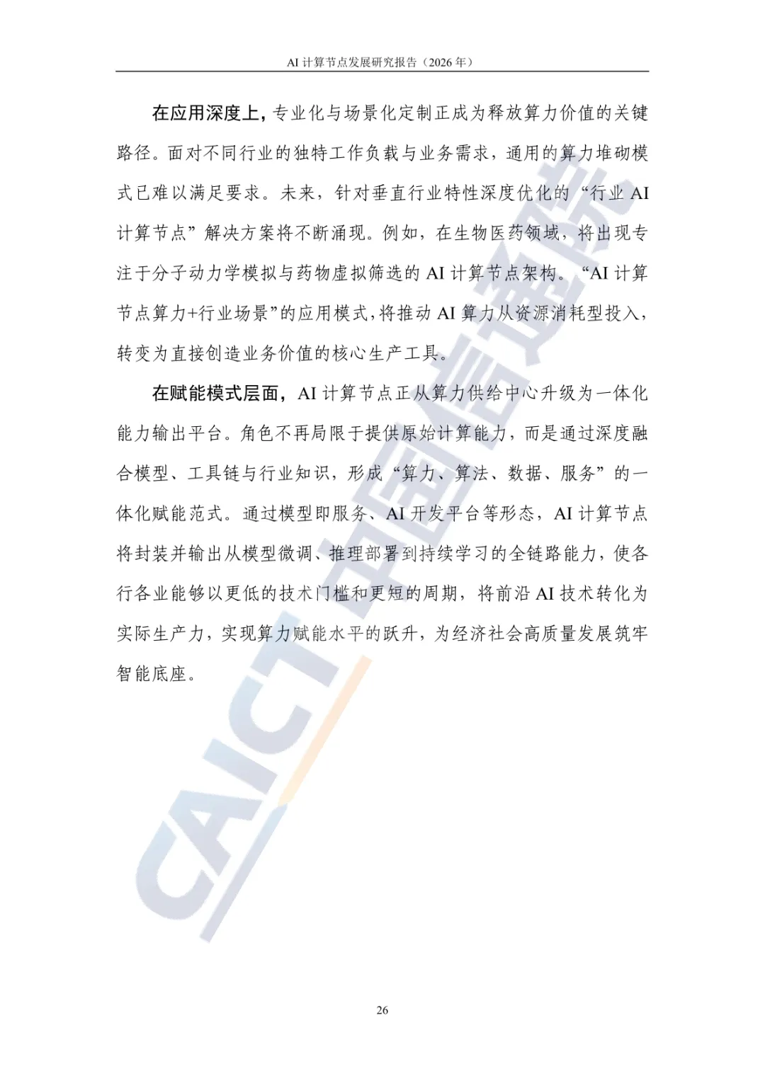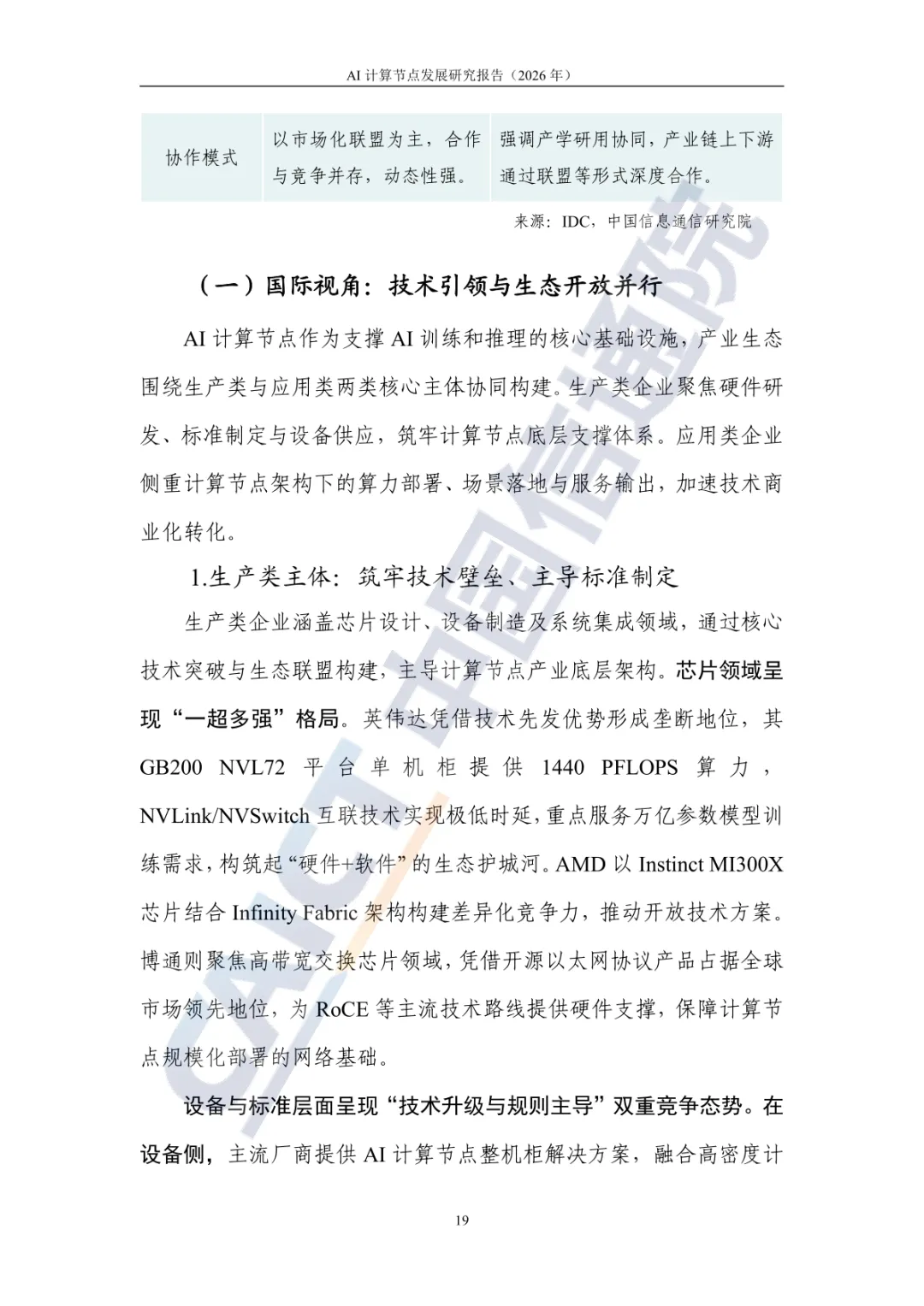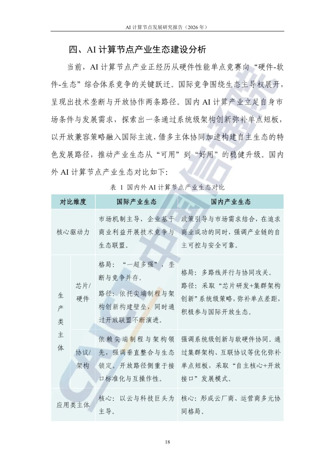 导读:AI 大模型参数规模与训练数据量爆发式增长,推动全球智算需求持续扩大,2025 年全球人工智能服务器市场规模达 1587 亿美元,AI 计算节点作为算力集群核心单元,成为破解算力瓶颈的关键。其以高密集约、高速超宽、高效灵活、高稳可靠为核心特征,通过架构重构与技术创新支撑智能算力高效输出。核心技术聚焦六大方向,节点架构从 “CPU 为中心” 转向 “GPU 互联为中心”,异构计算突破算力密度限制,超低时延网络破解数据传输瓶颈,HBM 与 CXL 技术缓解存储带宽压力,智能调度提升资源利用率,液冷等技术实现绿色低碳供能。应用场景覆盖大模型训练、高并发推理及行业智算,在金融风控、工业质检、能源调度等领域提供定制化算力支撑。产业生态呈现国际技术引领与国内自主创新并行格局,政策持续强化自主可控与协同发展导向。未来技术将向高效互联、高密集成演进,产业聚焦头部引领与生态协同,应用从试点向全域渗透,成为数字经济发展的核心算力底座。
