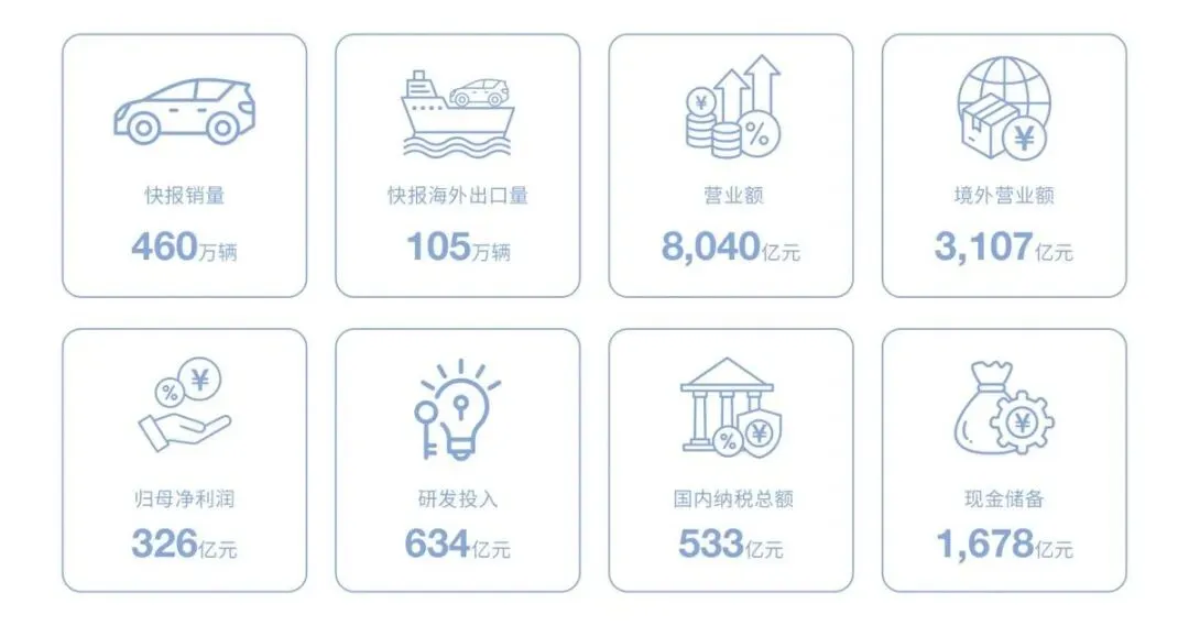 3 月 27 日晚间,比亚迪发布了 2025 年全年业绩报告。报告披露了当期营收、利润、研发投入、销量等核心经营数据,多项指标位列国内乘用车企业首位。财报核心数据显示,2025 年比亚迪全年营业收入 8040 亿元,国内纳税总额 533 亿元,现金储备1678亿元。值得一提的是,公司当期净利润 326 亿元,但研发投入却高达 634 亿元,发展底盘愈发扎实。销量维度,财报披露的数据显示,2025 年比亚迪全球累计销量 460 万辆,首次进入全球车企集团销量前五名,同时位列 2025 年全球新能源汽车销量、中国市场车企整体销量、中国汽车品牌销量三个榜单的首位。《证券时报》指出,在国内乘用车市场价格竞争加剧、全球汽车产业转型进入深水区的背景下,比亚迪这份财报的核心指标,展现了头部车企在行业周期波动中的经营稳定性,其营收、销量规模也进一步拉开了与国内其他车企的差距。研发投入方面,2025 年比亚迪研发投入 634 亿元,同比增长 17%。截至 2025 年末,公司累计研发投入超 2400 亿元,规模在国内主流车企中处于较高水平。据公司披露的业务信息透露,比亚迪研发投入主要聚焦于新能源汽车底层技术研发,同时推进研发成果的量产落地。2025 年,公司完成了第五代 DM 技术的优化迭代,在智能驾驶领域,天神之眼辅助驾驶系统完成全场景升级,推出智能泊车兜底承诺,搭载该系统的车型保有量位居国内车企首位。2026 年 3 月,比亚迪发布第二代刀片电池及配套闪充技术,该技术可实现常温环境下 10%-70% 充电时长 5 分钟、10%-97% 充电时长 9 分钟,零下 30℃低温环境下 20%-97% 充电时长 12 分钟,该参数为当前全球量产动力电池公开的最快充电速度数据。业务结构方面,2025 年比亚迪旗下腾势、方程豹、仰望三个高端品牌累计销量 39.7 万辆,同比增长 109%,完成了 10 万级至百万级乘用车市场的全价位段产品布局。海外市场布局上,截至 2025 年末,比亚迪乘用车业务已覆盖全球 119 个国家和地区,2025 年全年海外市场销量 105 万辆,同比增长 145%。当期,比亚迪巴西乘用车工厂完成首车下线,8 艘自有汽车运输船投入运营,其海外业务模式从整车出口,逐步向供应链本土化、本地运营及品牌建设的全链条布局转型。当前全球汽车产业电动化、智能化转型仍在持续,行业竞争已从单一产品竞争,转向技术、品牌、全球化布局及全产业链能力的综合竞争。而比亚迪的全球化布局已经从单纯的产品出海,升级为全产业链的本土化落地,分析人士认为,这种模式能够有效规避贸易壁垒、降低物流成本,也是其海外销量能实现翻倍增长的核心原因,为未来深耕欧美等汽车工业成熟的发达市场,加速全球化布局的深度与广度,提供了可以借鉴的成熟路径。