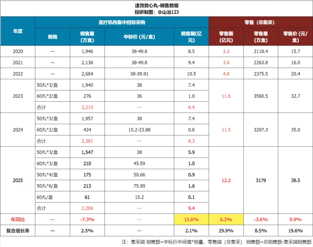 虽然今年集采端150丸/盒的主打规格单价依然是38元,没有降价 也没有明显低于零售端,但集采带来的销售额增长始终有相对更高的降价风险