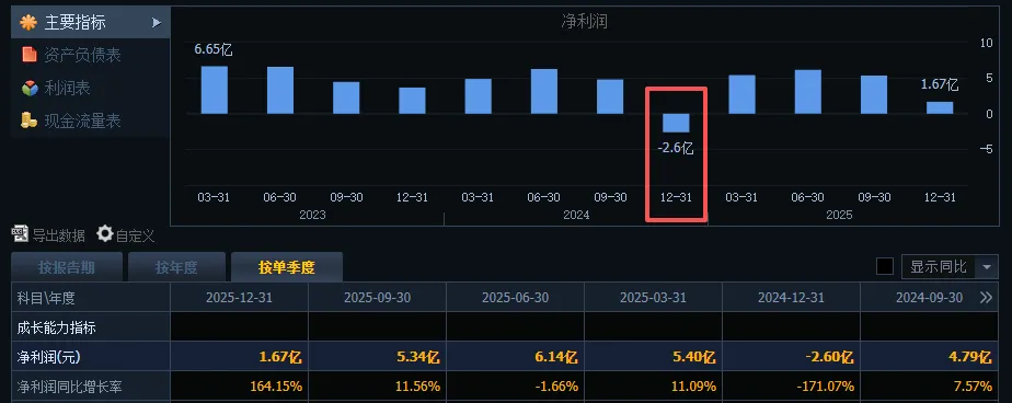 于是继续看单季度数据,就会发现24年四季度单季度亏损了2.6亿元,由于公司都是正常经营,怎么会出现亏损呢?一定是出现了额外的事项,把本应属于四季度的利润亏完之后,又多亏了2.6亿元。