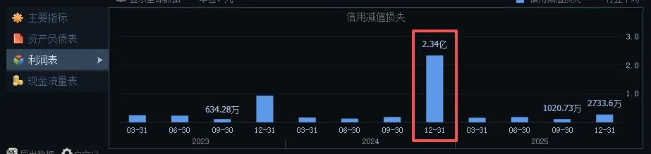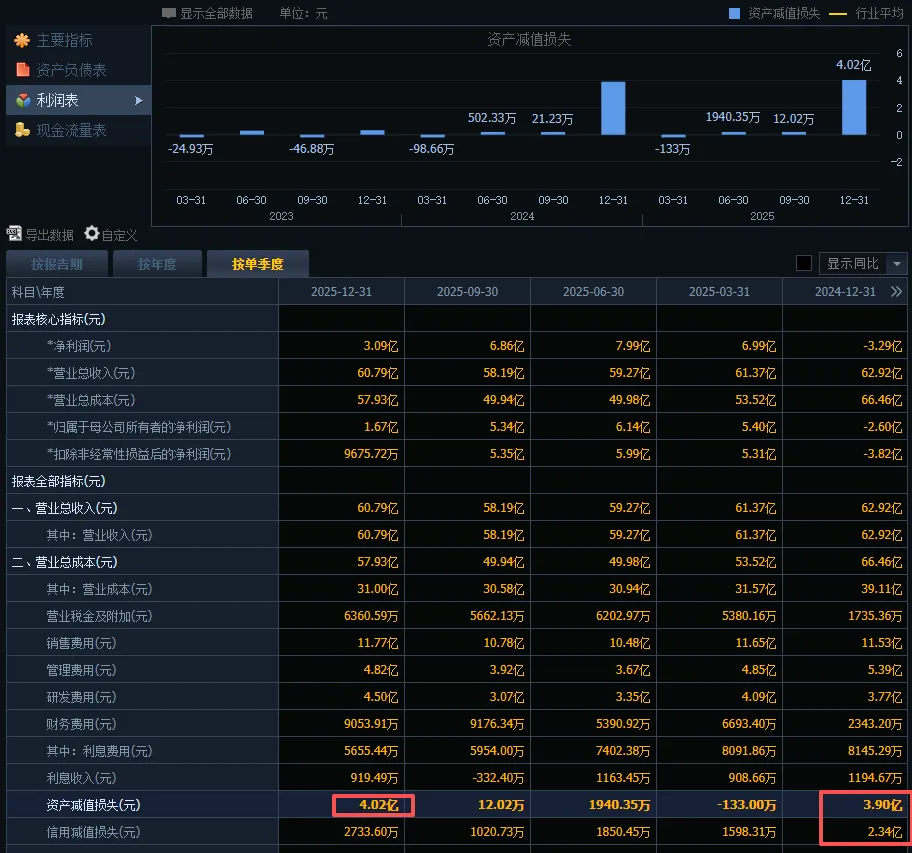 在其他费用都比较正常的情况下,发生了较大的资产减值和信用减值,导致了24年四季度业绩亏损,同样我们也发现25年四季度也出现了4亿的资产减值。