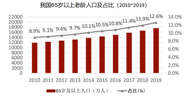中国人口老龄化规模大且增速快,2019年中国65岁及以上人口占比达12.6%,预计将在2022年进入深度老龄化社会。老龄化进程的加快或将进一步增加对我国医保基金的压力。