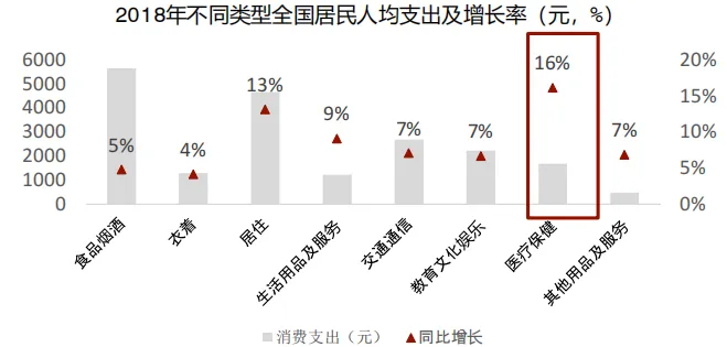 根据国家统计局公开数据显示,2018年城乡居民在医疗保健领域的消费支出增长迅速,为同期增长最快。据零点有数的疫情监测数据显示,疫情发生后人们在健康体检、保健养生方面的消费意愿净增长12.8%和12.1%。