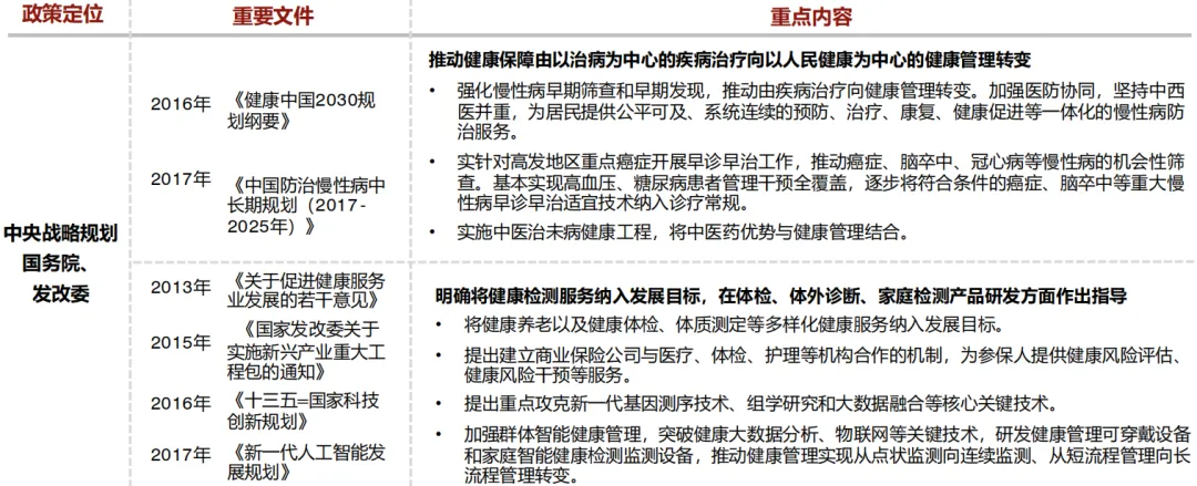 健康中国2030规划提出了我国医疗健康领域由疾病治疗向健康管理转型的战略目标。自2013年起,中央出台了多项政策支持公卫和非公体检发展,鼓励家庭健康检测产品和体外诊断/基因诊断产品研发。