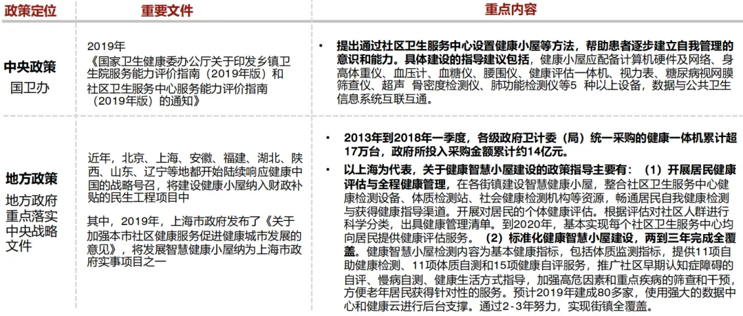 自2013年起,在中央政策的指导下,地方政府在公卫体检方面的投入不断增加。自2019年国家提出通过社区卫生服务中心设置健康小屋帮助居民健康管理后,各地都纷纷开始稳步推进健康智慧小屋建设。
