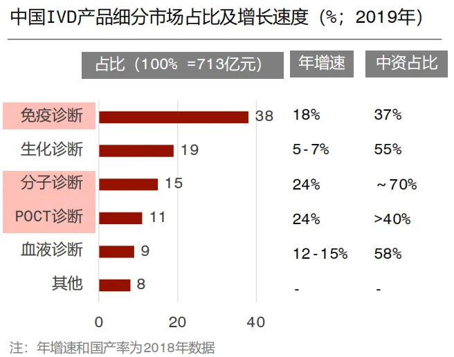 IVD产品按检测原理有多个细分领域,其中生化/血液属于比较传统的领域,免疫诊断规模大且发展迅速,而分子诊断/POCT等后起之秀则以每年20%以上的速度快速增长。