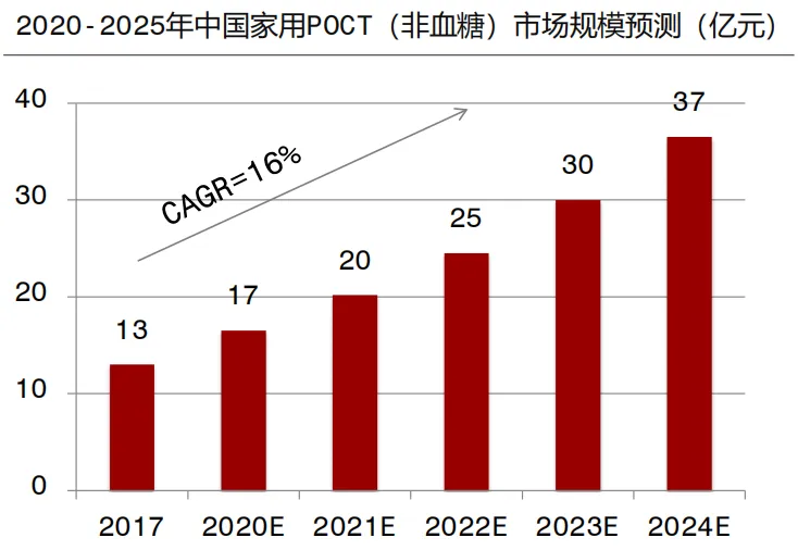 2020年,我国血糖POCT检测市场规模6.62亿美元,较2019年上升20.15%。随着人们健康意识的增强和医保政策的完善,这部分市场的增速将非常可观,市场前景十分广阔。2017年中国的POCT市场规模为79亿元。有报告显示,2017年全球自检产品和专业产品市场占比约为1:5(非血糖)。按此比例推算2017年家庭用POCT(非血糖)市场规模为13亿元。根据2020-2024年中国POCT整体市场规模,按上述逻辑推算家用(非血糖)市场在2024年将达到37亿元的规模。