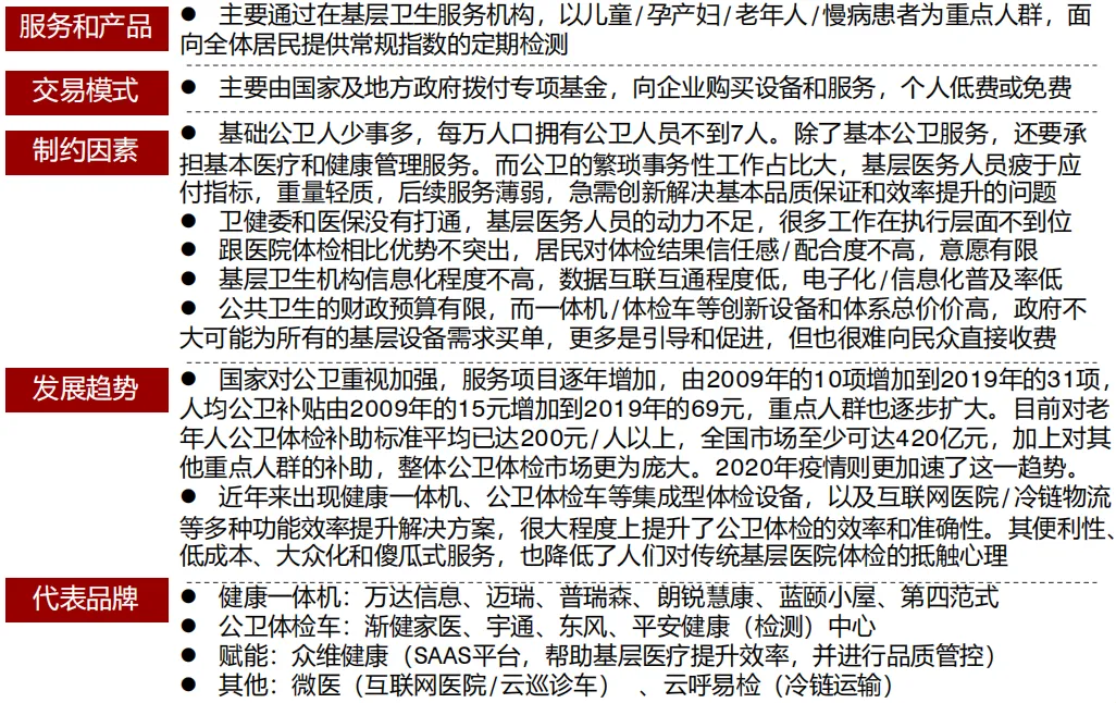 公卫体检细分领域至少有4-5百亿级的规模,传统模式效率极为低下,为一体机/体检车等创新模式带来商机。但目前主要依靠政府财政买单,预算有限,未来的商业模式还在初期摸索阶段。