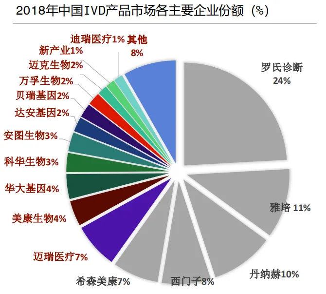 中国的IVD产品市场目前是一个外资寡占的状态,前5名均为外资,约占6成的市场份额。国产品牌与外资之间的技术差距大,但发展迅速,市场份额已达4成。