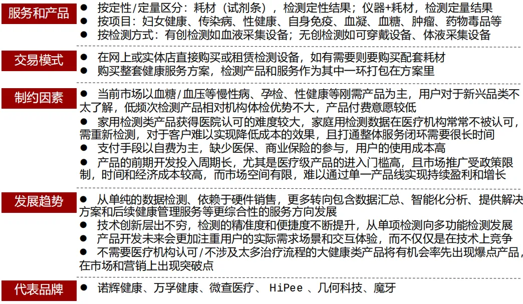 消费者通常可自行购买的各种家用健康生理指标检测设备和服务(包括除了基因检测以外的体外诊断产品/服务,含IVD消费级服务)本调研着重聚焦于有先进智能创新功能的家庭检测解决方案。