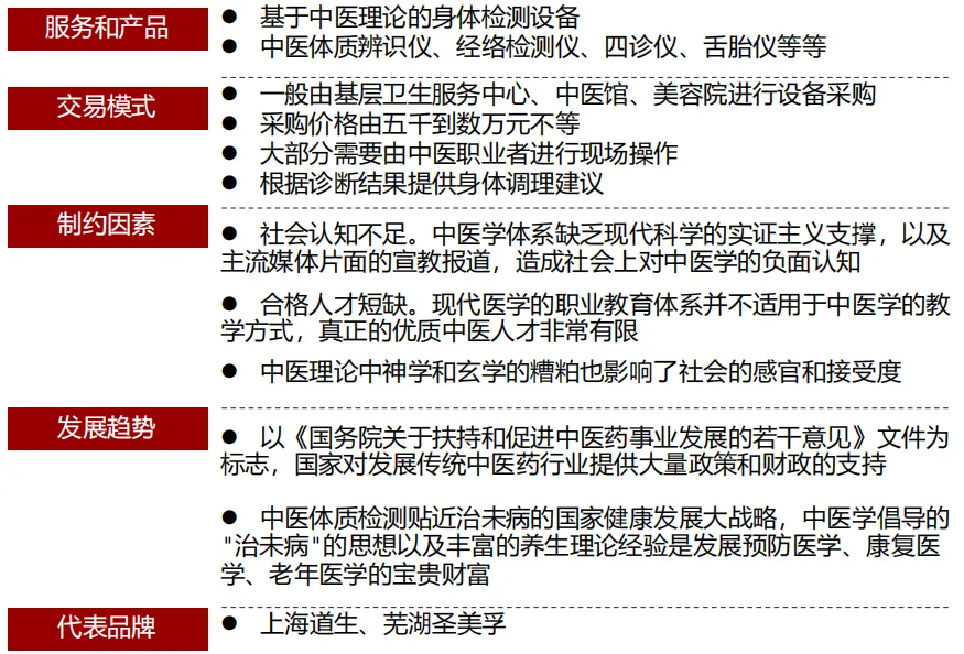 将中医的望闻问切理论标准化,形成一套关于人体体质类型及身体状态等的检测工具,并基于检测结果,进一步地提供相关的服务或产品。(非本调研重点领域,但覆盖基本信息收集)