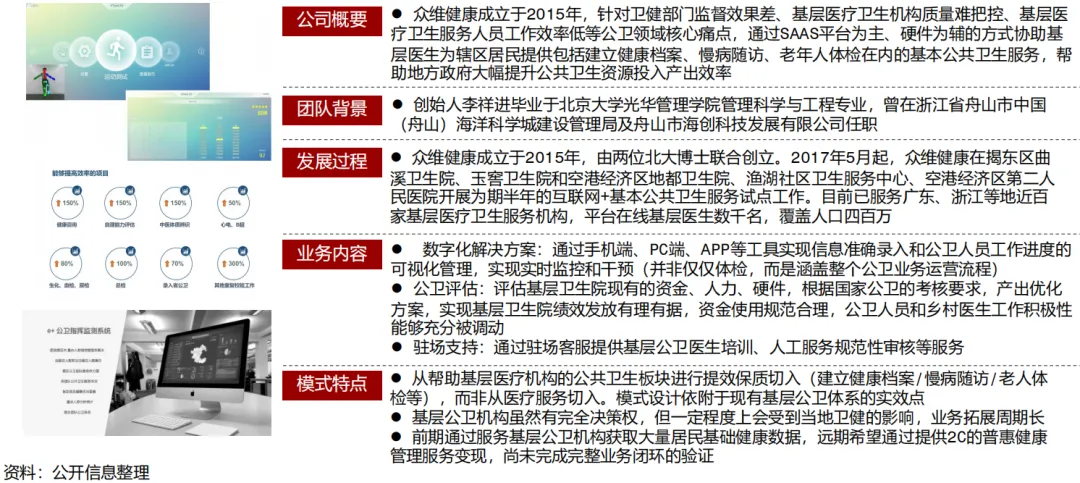 众维健康通过SAAS平台协助基层卫生机构开展健康档案建档、慢病随访和老年人体检工作,以此积累大量C端基础健康数据,远期通过2C的普惠健康管理产品/服务实现业务闭环。