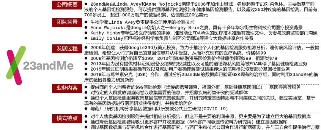 23andMe是最早期的消费级基因检测公司之一,主打基于个人基因的健康风险筛查,祖源追溯等服务;后续组件基因大数据库,并与药企,研究机构研究疾病,开发新药,用以提供相关诊疗方案。