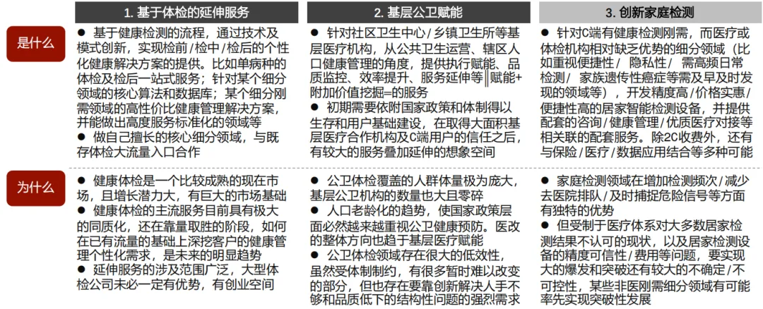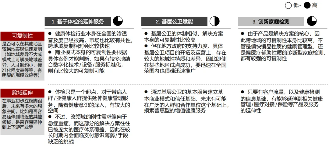 创新健康检测领域的市场比较有共性,且解决方案中天然会包含不少数字化信息/硬件设备/流程标准化等要素,因此解决方案的可复制性较高,且往健康管理服务延伸的空间也比较大。