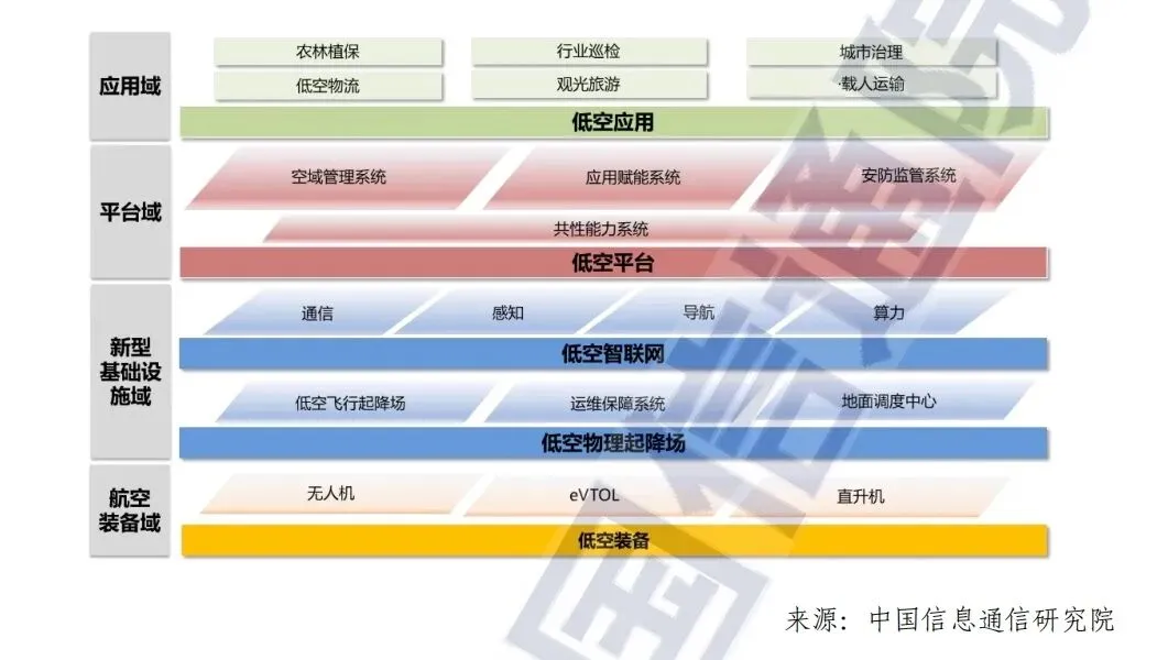 报告指出低空产业的“四域”体系架构:航空装备域(核心载体),涵盖以无人机、eVTOL为代表的新型低空装备,以及以直升机、固定翼飞机为代表的通用航空装备;新型基础设施域(关键支撑),由低空智联网(通信、感知、导航、算力等信息通信设施)和低空物理场(通用机场、eVTOL起降场、无人机起降平台构成;平台域(先决条件),通过实现各类共性数据汇聚与处理,构建共性能力系统,支撑空域管理、低空安全、应用赋能三类业务系统;应用域(发展牵引),聚焦于各类应用的广泛拓展,涵盖低空农林植保、行业巡检、物流运输、城市智慧管理、载人飞行等多个领域的应用系统。