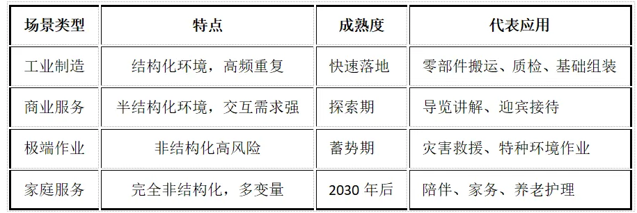 人形机器人的商业化落地遵循“从易到难”的渐进路径,按场景复杂度可分为四个层级: