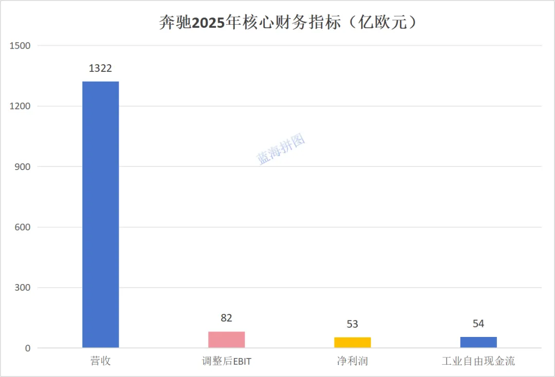 2025年,奔驰实现营收1322亿欧元,同比下降9.2%;调整后EBIT82亿欧元,同比下降40.1%;净利润53亿欧元,同比下降49%;工业自由现金流54亿欧元。尽管集团依然保持着千亿欧元级的庞大体量,但赚钱能力遭遇了严峻挑战。