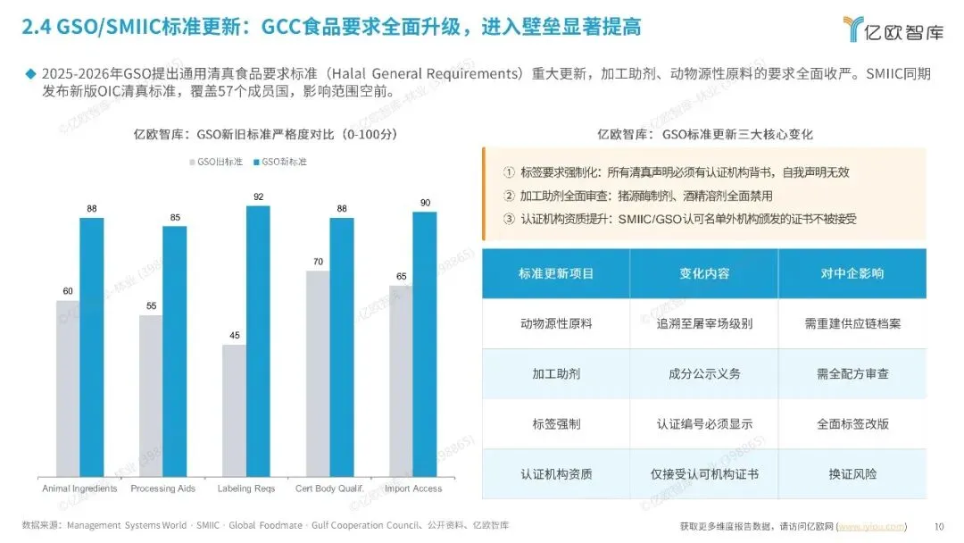 地位:海湾六国准入门槛,对食品添加剂来源审查严格。 特点:认证壁垒最高、成本最贵,耗时120天,费用1.5-2万美元。 更新:2026年标准全面升级,强化原料追溯、成分公示与标签规范。 OIC/SMIIC标准
