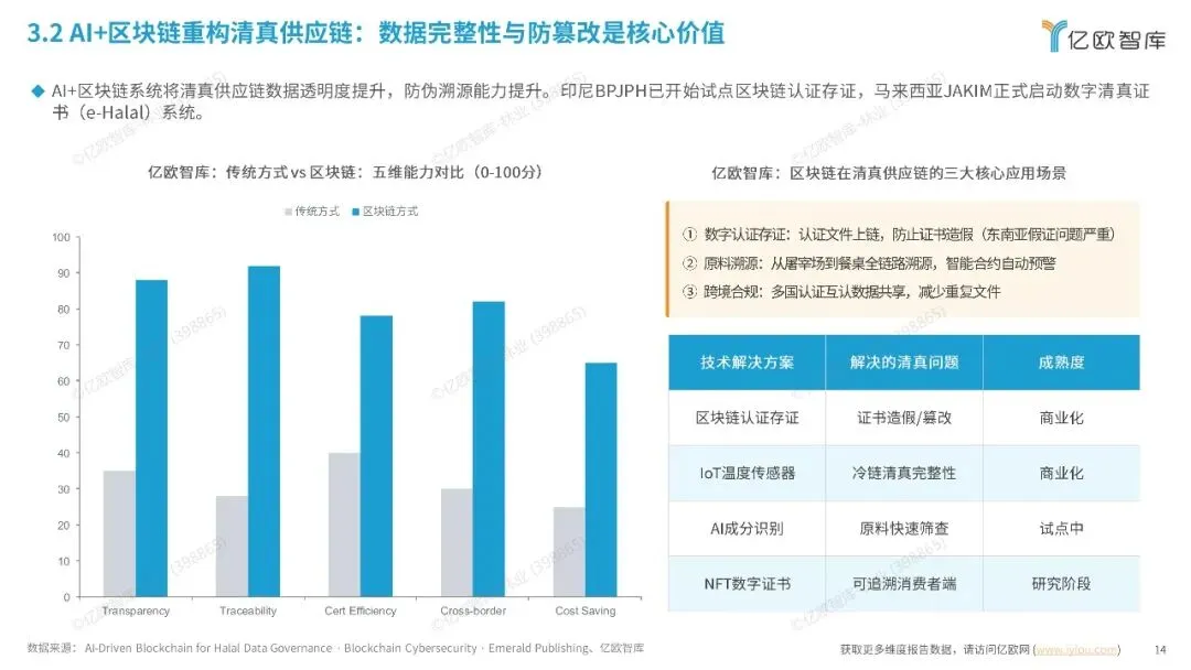 AI+区块链:提升认证效率30%-40%,实现证书防篡改与全程溯源。例如,马来西亚试点“Halal Chain”项目,记录产品从农场到货架的全流程。 物联网传感器:监测运输环境数据,确保冷链物流合规。 AI成分筛查:快速检测化妆品、药品中的非清真成分。 冷链物流升级