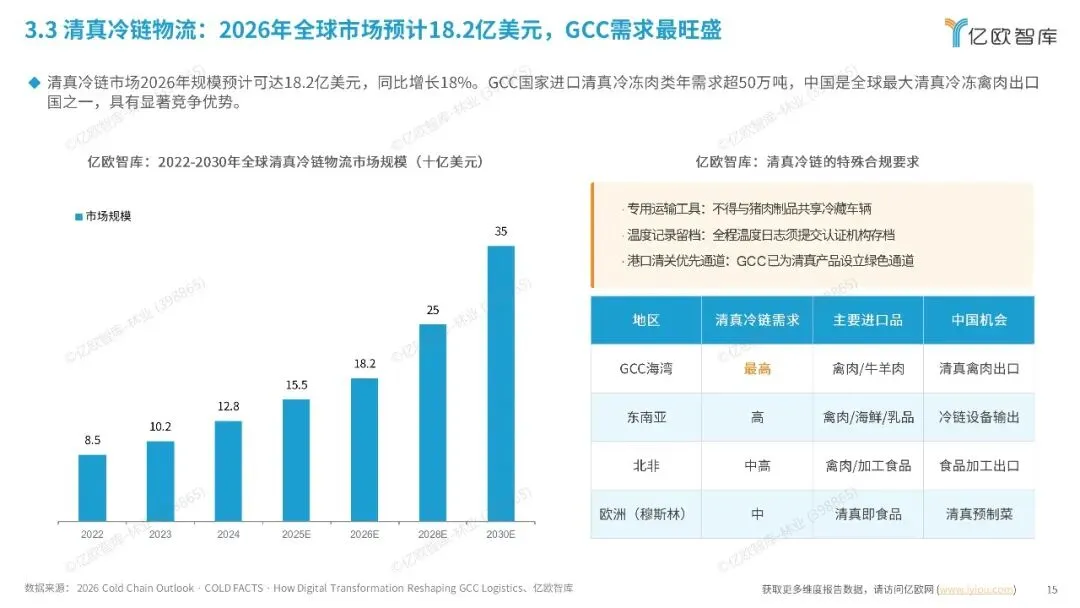 市场规模:2026年全球清真冷链物流规模达18.2亿美元,GCC地区需求最旺盛。 标准提升:专业化清真供应链接近制药级物流标准,设立专用冷链、分离输送管线与仓储区域。 区域枢纽建设