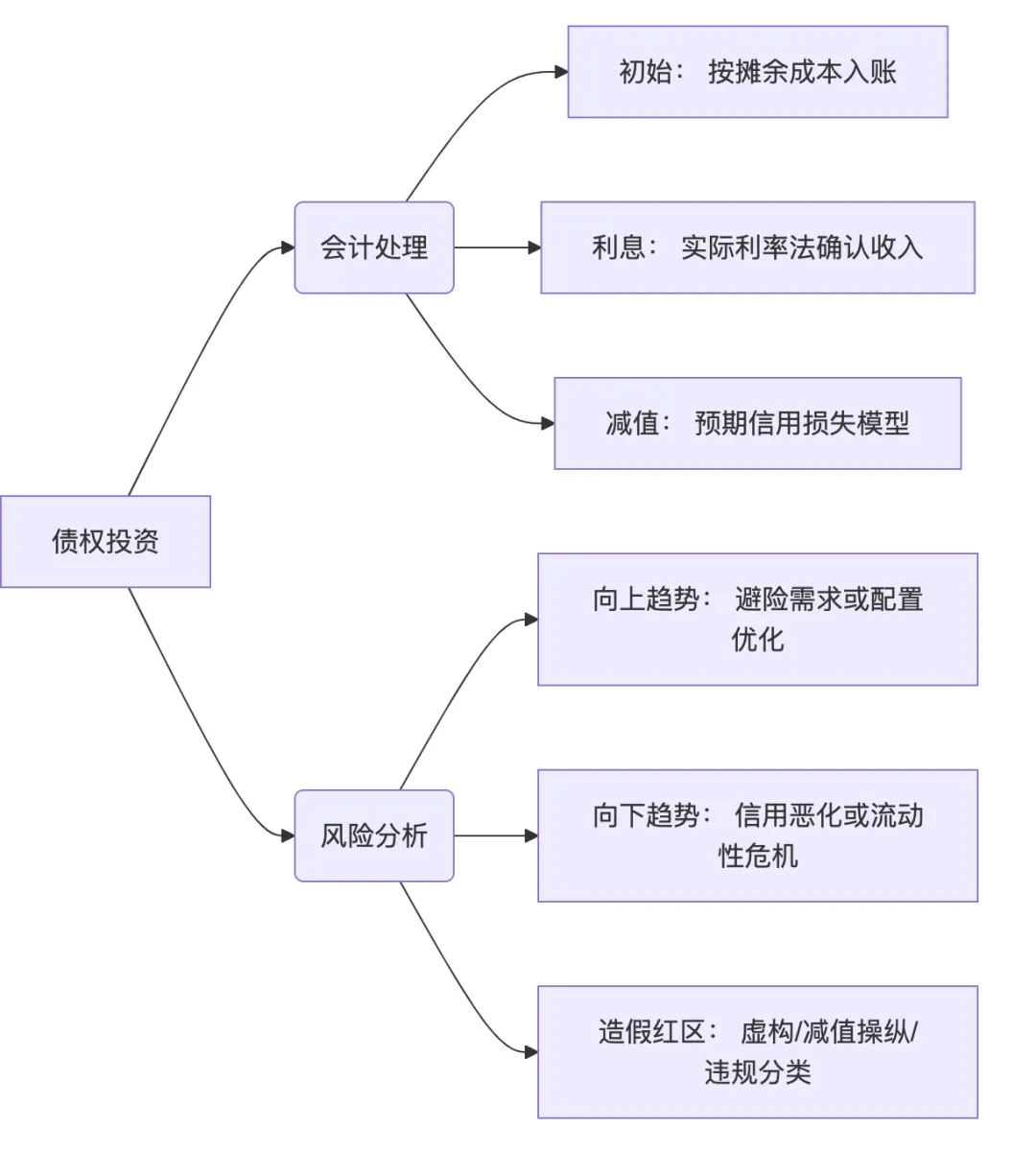 1. “债权投资”是企业配置长期资金的“压舱石”。其核心价值在于平衡风险收益(如配置国债等),但高信用债占比需警惕违约风险。趋势上升多源于风险对冲及避险需求,下降常关联收缩投资或资产恶化。