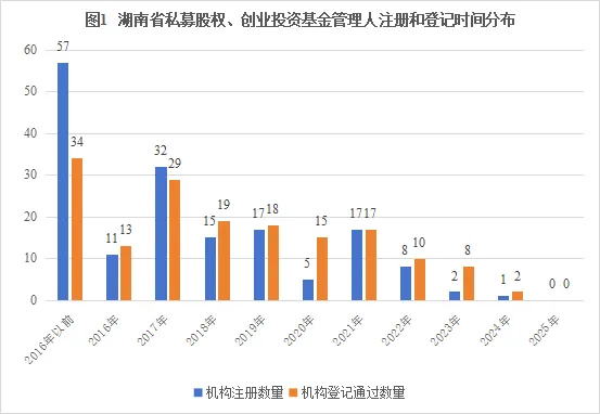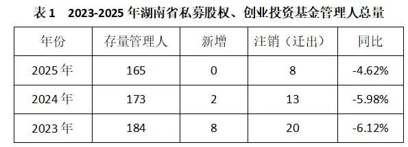 截至2025年底,湖南省存续的私募股权、创业投资基金管理人共计165家,其中1家证券公司私募基金子公司(股权、创投)。2025年无新增管理人,注销管理人7家,迁出管理人1家,同比下降4.62%。