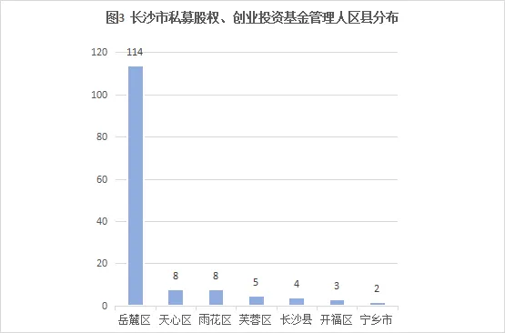 从管理人地域分布情况来看,市州分布不均现象明显。其中,长沙市共有管理人143家,占比87.88%;邵阳市、永州市、张家界市和湘西州自治区4个市州尚无登记的管理人。长沙市管理人主要分布在岳麓区,有114家,占长沙总量的78.62%,占全省总量的69.09%,湘江基金小镇聚集效应显著。