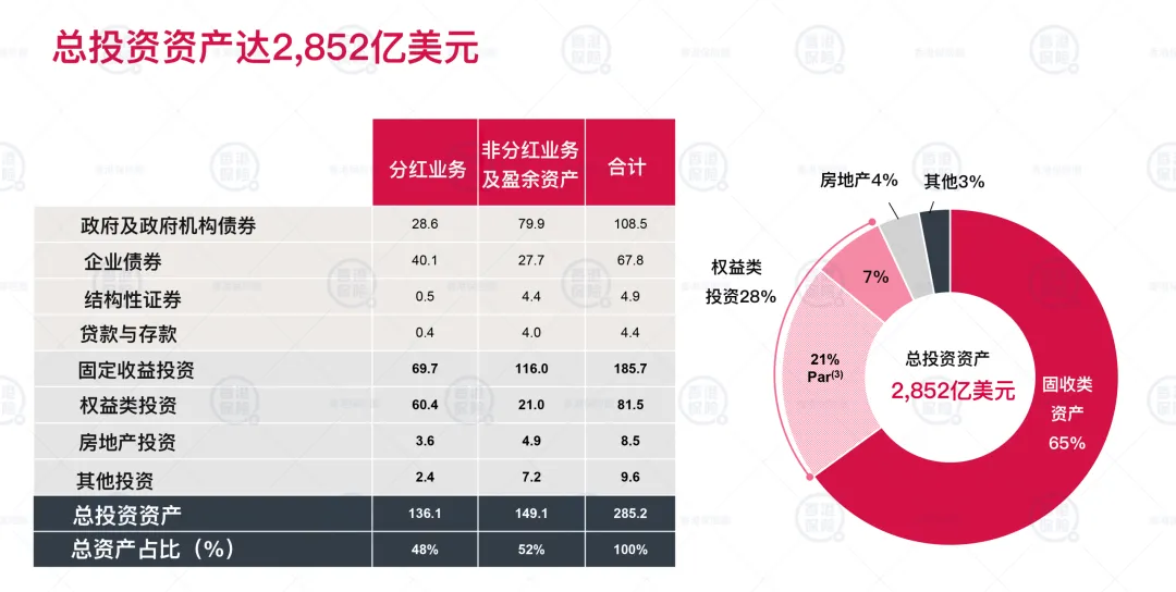 3月19日,AIA友邦保险公布2025全年亮眼成绩单:总投资资产高达2,852亿美元,同比提升11%;集团总资产与2024年相较同比提升13%至3,454亿美元!新业务价值达55亿美元,同比增长近20%;年化新保费取得95亿美元,同比增幅超10%!香港友邦新业务价值与年化保费齐破历史新高,以近三分之一的增幅稳居全球领航者地位!(往期:2024年业绩表现)尽管2025年地缘政治与宏观经济仍存在不确定性,亚洲的人寿与健康保险市场的发展前景依旧广阔。友邦保险凭借全面的区域布局与高度聚焦的投资策略,已占据独特优势,充分把握此轮增长机遇!读懂保险公司的盈亏,从这四个关键财务指标开始。您不需要成为专业的精算师,香港保险圈从非专业角度为您分辨:新业务价值:今年签下的保单,未来能赚多少钱的折现总利润;内含价值:保司所有保单和现有资产在当下的“身价”,基本包含“调整后的净资产”和“有效业务价值”两个部分;经调整的税后运营利润:简单可理解为保司主营业务的真实盈利能力(税后)在2025年实现四大核心指标双位数增长的强劲驱动下,友邦保险再度增长10%全年股息至193.08港仙。(1.93港元/每股)优异的经营表现与持续提升的股东回报,共同构筑AIA“叫好又叫座”的发展格局!作为行业领先代理团队的基石,友邦「最优秀代理」策略再造历史峰值达43亿美元,贡献整体新业务价值73%,同比增长13%,核心引擎地位愈发稳固!其增长动力源于活跃人力扩张、产能提升以及高吸引力、高资本效率的盈利产品组合!友邦保险银保渠道迎来重大增长机遇!与2022年相比,友邦银保渠道贡献新业务价值利润率约为45%,同比增长6%,新业务价值同比增长2.4倍,主要得益于活跃的保险营销员队伍以及超过15家、平均合作长达20年优质银行伙伴的强力支持!香港友邦极具吸引力且优质的产品组合驱动强劲持续的客户需求,2025年友邦香港新业务价值提升21%,客户总数达300万名,新客户贡献新业务价值占总体38%,作为港澳地区第一名的代理团队,香港友邦代理渠道新业务价值同比激增26%至160亿美元。香港友邦年化保费及新业务价值再造历史峰值,强势领跑国际市场!1.总资产达2,852亿美元,固定资产占比达65%截至2025年12月31日,友邦保险总投资资产高达2,852亿美元,同比提升12%,固定类资产高达1,857亿美元(同比提高5%),占总资产65%。政府(含机构)及企业债券构成友邦保险固定资产的基石,合计占比高达95%!值得关注的是,其73%的债券久期在10年以上或无固定期限,再一次清晰地解释了公司为分红产品储备长期收益动力的投资策略。地域高度集中,中国内地和泰国为主要来源国家,合计占比达65%,美国则缩减至10%;债券评级优质,政府机构债券评级稳定,非投资级别债券仅为整体的1%在友邦保险678亿美元的企业债券评级中,A及以上的评级占总体仅60%,较为稳定。始于优异,终于守护!作为香港首款6.5%旗舰险,友邦「环宇盈活」全线提升中短期回报,30年预期IRR高达6.5%,让财富更具底气;新增567提取密码,资金提领更自如;同时首创两大传承选项,为未成年受益人加固权益的同时前瞻性融入认知危疾支援,与「盈御」系列完美互补,为客户提供财富增值+灵活提取+代际传承+危疾支援的全方位保障!直面全球宏观环境的挑战与变局,友邦保险深耕亚洲市场的战略定力与增长潜力愈发凸显。中国内地与香港正构筑友邦最坚固的发展基石。2025年,AIA以优异的财务成绩和投资表现证明其强大经营韧性!迈入2026,友邦将乘势而上,保持强劲增长,为360万港澳客户擘画并实现“健康、长久、好生活”的全新价值!本站内容除非注明原创,否则均为网友转载,涉及言论、版权与本站无关,如有侵权请联系删除。本微信公众号所载任何文章、音视频、数据及资料并不构成亦不应被诠释为向香港境外之任何人士招揽、要约、出售、提供、建议或游说购买任何保险产品。上述任何资料仅供参考,有关内容只属一般资讯,不构成投资建议。就上述任何资料提及的主题作出任何决定前,建议向专业人士寻求独立意见。内容若来源于网络,版权归原作者所有。如有侵犯请及时联系,我们将立即删除