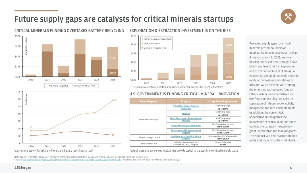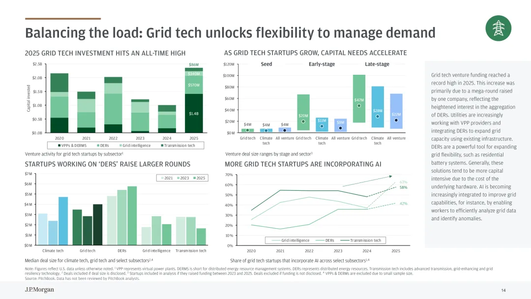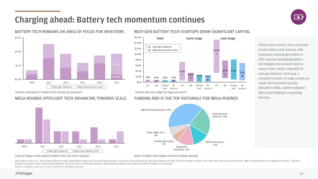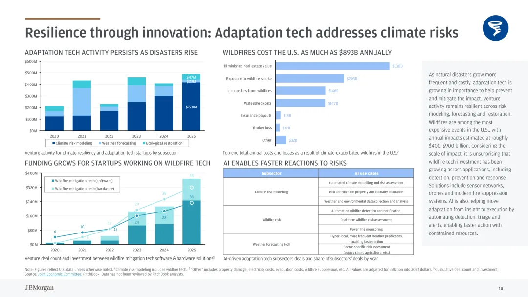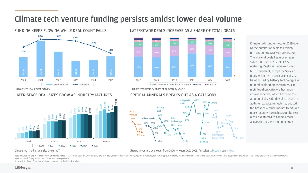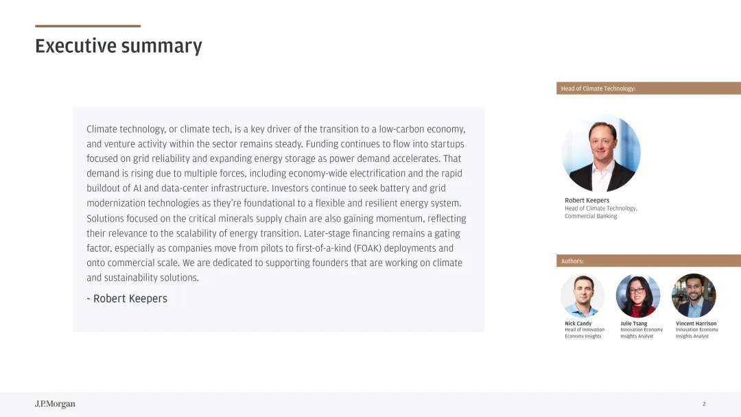 气候科技已成为低碳经济转型核心驱动力,电力需求增长推动行业持续发展。数据中心规模化扩张与经济全面电气化带动电力消耗攀升,美国能源部预测 2028 年 AI 相关数据中心电力需求将翻倍,可再生能源与储能技术成为关键解决方案。行业投资呈现结构性特征,2025 年气候科技融资规模逆势增长,后期项目占比提升,反映行业逐步成熟。关键细分赛道表现突出,电网技术投资创历史新高,分布式能源资源整合与 AI 赋能成为重要方向;电池技术持续受资本青睐,下一代电池研发与商业化推动融资增长;临界矿物领域异军突起,融资规模较 2020 年翻倍,应对全球矿物供需缺口。气候适应技术需求随灾害频发上升,野火防控等领域的软硬件解决方案获得更多关注。行业面临 “融资缺口” 挑战,试点到商业化规模化阶段的资金支持不足。未来需强化政策引导与多元融资机制,推动电网现代化、临界矿物供应链完善与气候适应技术创新,助力气候科技从试点走向规模化应用。