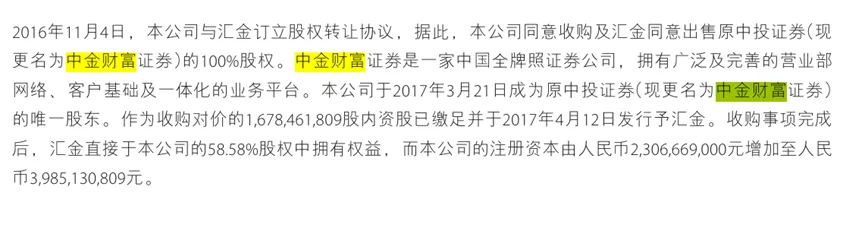 这部分是中金为了买下中投证券100%的股权与汇金交易下来的总对价。