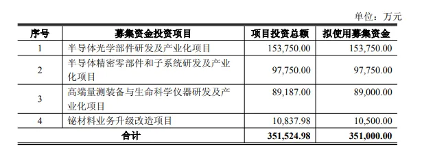 扣除发行费用后,募集资金净额将用于半导体光学部件研发及产业化项目、半导体精密零部件和子系统研发及产业化项目、高端量测装备与生命科学仪器研发及产业化项目、铋材料业务升级改造项目。