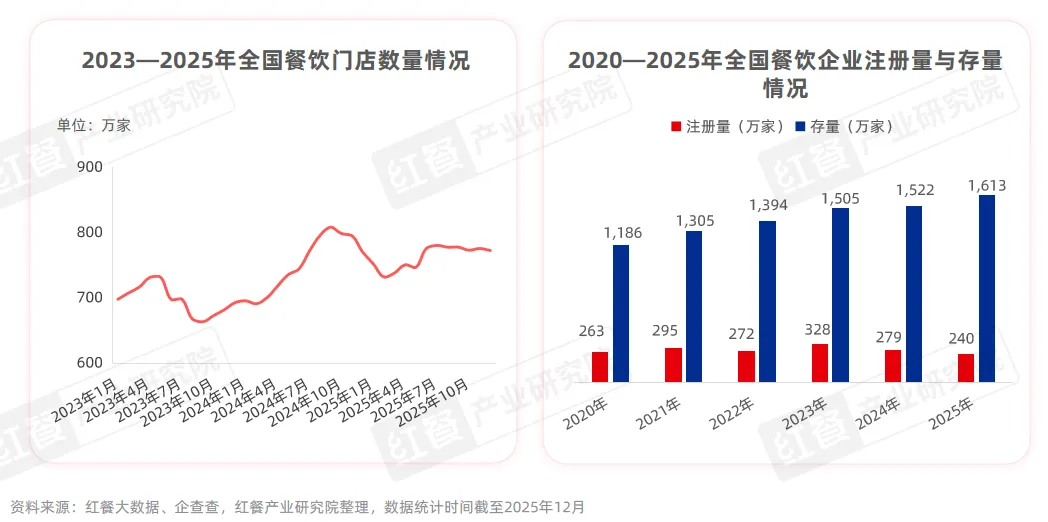 近年来,我国餐饮市场在经历了快速增长后,逐渐进入存量竞争阶段。红餐大数据显示,2023—2025年,全国餐饮门店数量呈先升后降再趋于平稳的走势,截至2025年12月,全国餐饮门店数量已超过770万家,同比增长0.31%。