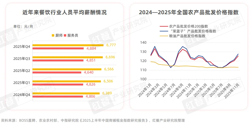 从餐饮企业经营层面来看,人工、食材、租金等核心成本持续攀升,企业的利润空间不断被挤压。以人工成本为例,据BOSS直聘,2025年第四季度,餐饮行业厨师与服务员的平均薪酬分别达到6,777元/月和4,884元/月,同比增长6.1%和1.6%。
