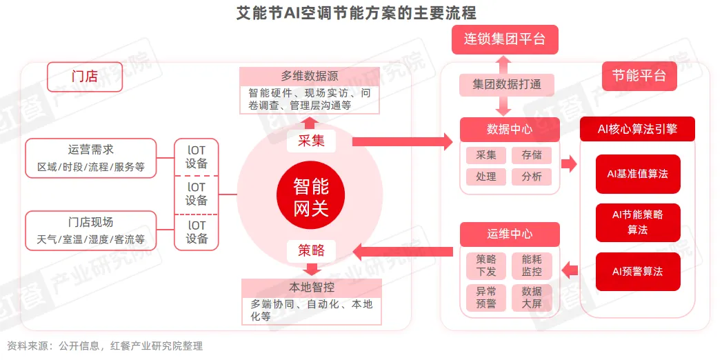 据红餐产业研究院了解,艾能节的这套AI空调节能方案主要由智能硬件、AI算法与RaaS平台构成。其中,智能硬件作为感知与执行层,负责门店多维数据的采集与本地策略的执行;AI算法引擎作为决策层,基于国际标准构建能耗基准值算法、节能策略算法以及预警算法三大核心算法体系;RaaS平台(Results as a Service,节能效果保障平台)则以可量化、可验证、可持续的节能结果为核心交付标准,全面统筹数据汇聚、策略统筹以及效果监测等。三者协同推进,形成“感知—分析—决策—执行—反馈”的完整闭环,并持续迭代升级。