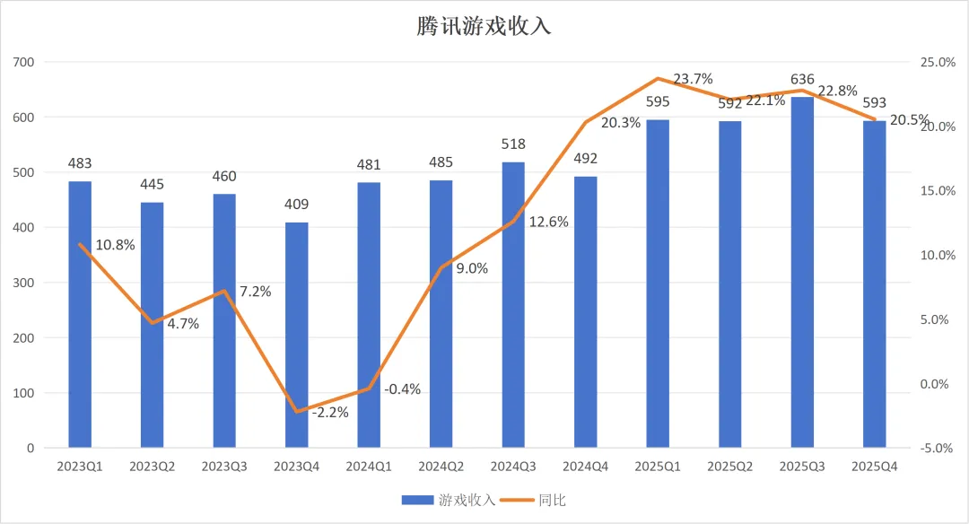 从2024年初被点评为“躺在功劳簿上”,到2026年年会上盛赞“强得可怕”,腾讯游戏在两年间完成了一场令人瞩目的战略蜕变。2025年,其游戏业务在庞大基数之上仍实现了22%的强劲增长,全年总收入高达2416亿元;其中第四季度营收593亿元,同比大增20.5%。这一系列数据不仅印证了马化腾评价的180度转变,更有力地证明了游戏业务作为腾讯最坚固“现金牛”的底座地位,其增长引擎依然动力澎湃。
