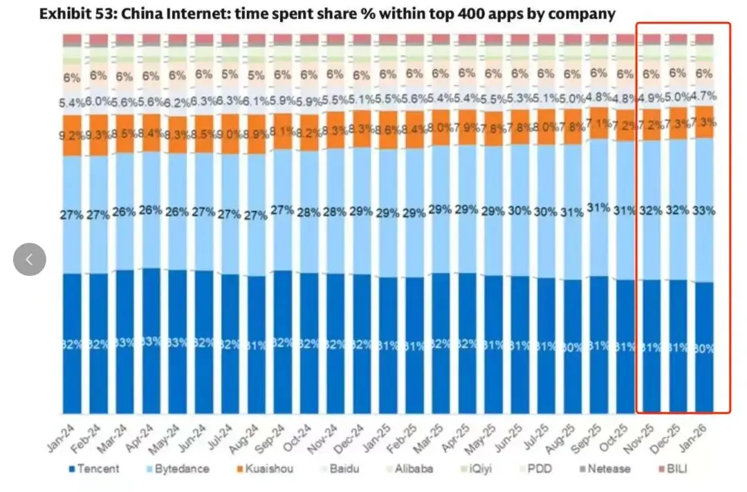 在流量红利见顶的今天,互联网的商业逻辑已彻底重构。这不再是一场关于用户数量的“圈地运动”,而是一场关于用户时间的“零和博弈”。只有让用户留在自家的app里,才有无限可能。高盛的研报显示,在25年的9月,腾讯和字节旗下的所有app时长加总,基本就打平了,但到了今年1月,字节系已经明确领先腾讯系大概3%了。如果这个趋势继续,到2026年底字节系可能会领先5%-10%。到那时候,广告主会怎么想?他们会把预算更多地倾斜给抖音,而不是腾讯。腾讯的营销服务收入,可能会从「增长 20%」降到「增长 10%」,甚至更低。