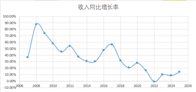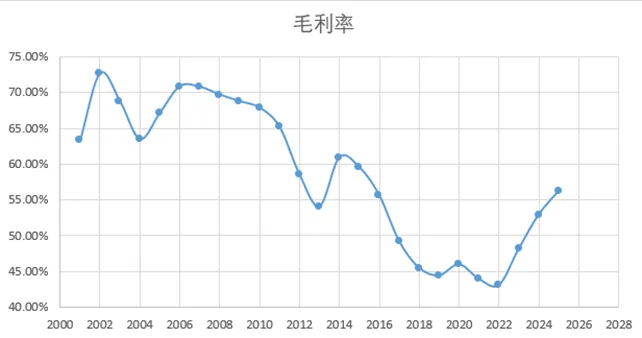 毛利率也是在22年43%见底后,最近几年在持续回升,25年提升到56.21%。毛利率变化图如下: