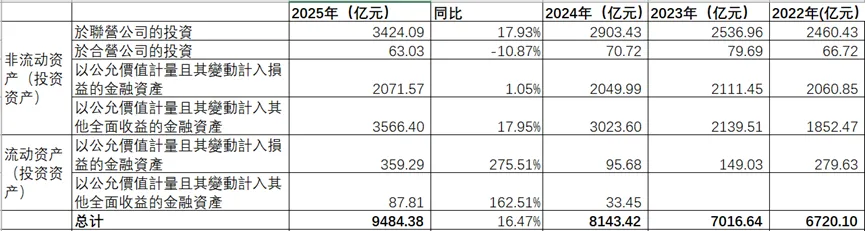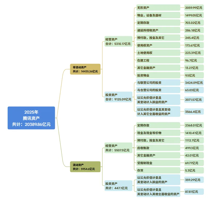 腾讯的资产共20389.86亿元,净资产为12410.65亿元。我们人为的分为经营资产和投资资产,其中经营资产合计10817.67亿元,投资资产合计9572.19亿元。