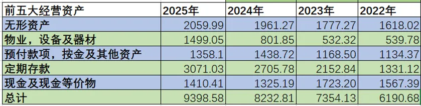 其中资产的前五大为:无形资产、定期存款、预付款,按金和物业,设备及器材和现金及现金等价物,共9398.76亿元。占比经营资产86.88%