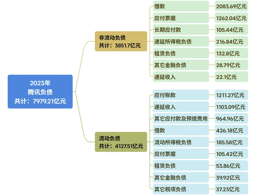 腾讯25年的负债总共为7979.21亿元,其中借款+应付票据为3877.33亿元,占比48.59%。