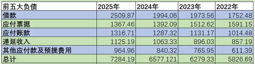 前五大负债如下,25年的借款也是增加42%。递延收入一直有较好的增长,22和23年有近5%的增长,24和25年则有10%+的增长,这部分是暂时放在负债中的收入。