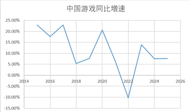 由元宝和豆包提供的近十年中国行业游戏增速如下,24年和25年是在7.5%左右,预期26年增速为7%,腾讯比行业高2%,则腾讯的游戏增速为9%。
