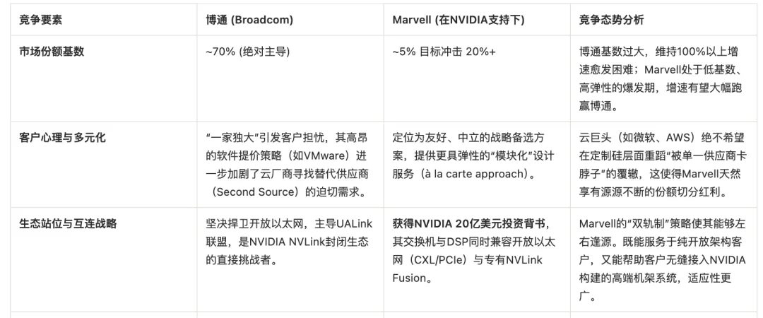 双头垄断格局——Marvell与博通(Broadcom)的非对称博弈在定制硅和高速互连赛道,博通(Broadcom)是Marvell不可回避的终极竞争对手。通过拆解两大巨头的竞争态势,可以更清晰地判断此次英伟达投资的行业涟漪效应。博通无疑是当前的绝对霸主。据分析,博通目前占据了定制AI加速器市场超过70%的份额,其顶级客户包括谷歌(合作开发TPU芯片逾十年)、Meta以及OpenAI等。在2026财年第一季度,博通的AI半导体收入暴增106%,达到创纪录的84亿美元。此外,博通在高端以太网交换芯片(Tomahawk系列)领域也掌握着定价权。然而,在产业界“反脆弱”的需求驱动下,Marvell找到了非对称竞争的切入点,并构筑了三大核心逆袭逻辑:正如华尔街分析师所言,投资博通是买入行业发展的“确定性(Safer Investment)”,而投资Marvell则是押注市场格局再平衡带来的“高爆发弹性(Bolder Investment)”。英伟达的介入,无异于在天平属于Marvell的一端重重地加上了20亿美元的砝码。