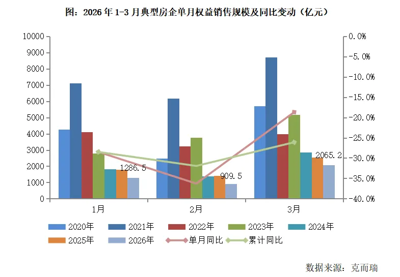 2026年3月,典型房企实现单月销售权益金额2065.2亿元,环比增长127.1%,前3个月累计实现销售权益金额4261.2亿元。