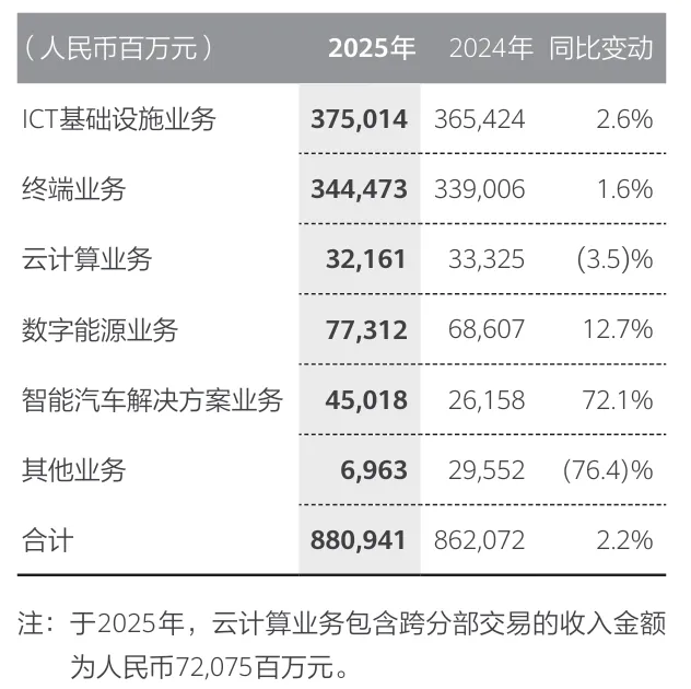 回首2025年,华为ICT基础设施业务收入为3750.14亿元人民币,收入同比增长2.6%;终端业务收入为3444.73亿元人民币,收入同比增长1.6%;云计算业务收入为321.61亿元人民币,收入同比下降3.5%;数字能源业务收入为773.12亿元人民币,收入同比增长12.7%;智能汽车解决方案业务收入为450.18亿元人民币,收入同比增长72.1%。