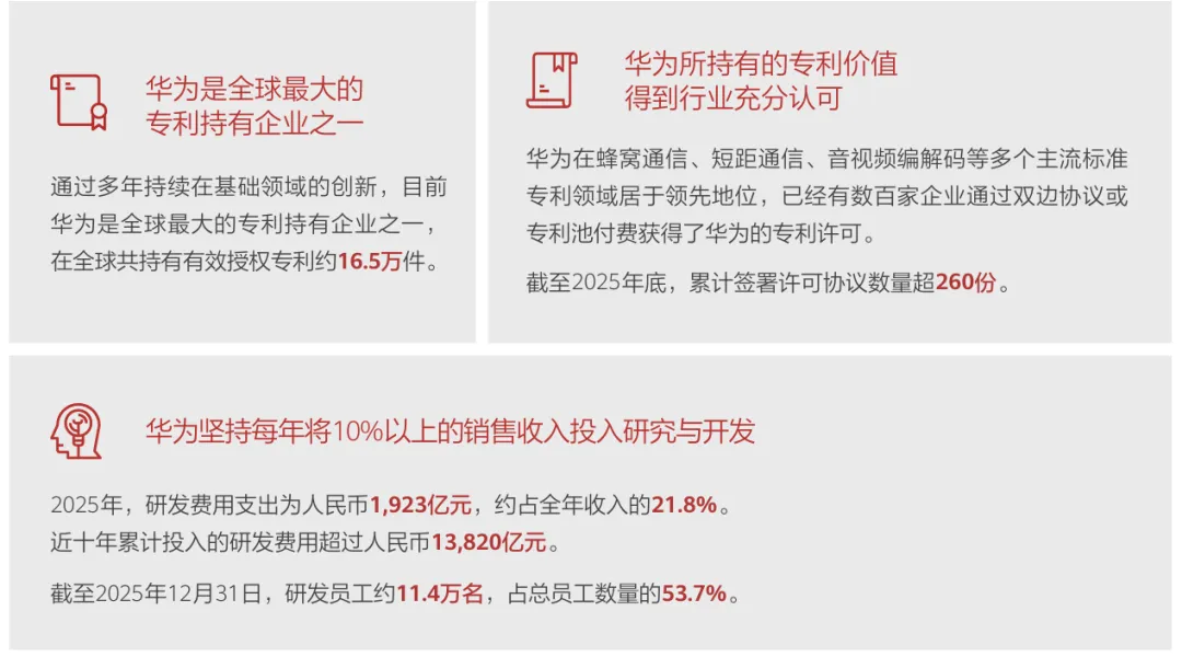 在研发上的高强度投入,也让华为成为全球最大的专利持有企业之一。据财报,华为在全球共持有有效授权专利约16.5万件,截至2025年底,累计签署许可协议数量超260份。