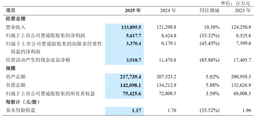 中兴通讯作为国内通信行业的另一核心力量,2025年财报呈现出“分化增长”的态势,通信业务同样面临压力,但凭借业务结构调整展现出一定韧性。财报显示,中兴2025年实现总营收1339.0亿元,同比增长10.4%,归母净利润56.2亿元,整体表现优于行业平均水平。但细分来看,其核心的运营商网络业务实现营收628.6亿元,占总营收的46.9%,受国内通信基础设施投资下降影响,国内市场营收承压,仅依靠国际市场“大国大T”战略的推进,实现一定增长。