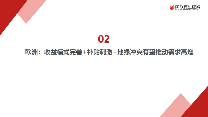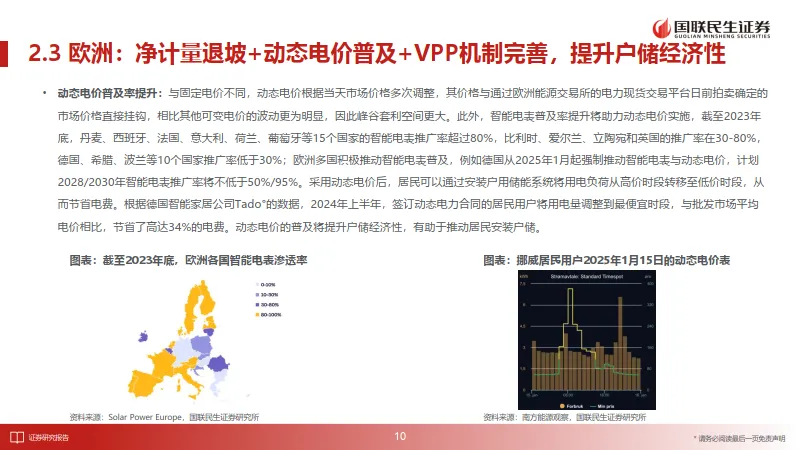 欧洲:收益模式完善+补贴刺激+地缘冲突有望推动需求高增。欧洲风光发电占比高影响电网消纳,催生配储需求; 2022-2024年间欧洲户储在户 光的平均渗透率为20%,仍处于较低水平,提升潜力较大。欧洲户储收益模式完善,净计量退坡+动态电价普及+VPP机制完善,提升户储经济 性;各国陆续推出补贴,刺激户储需求;叠加地缘冲突加剧或推动天然气和电价上涨,户储投资回收期缩短,有望推动欧洲需求高增。
