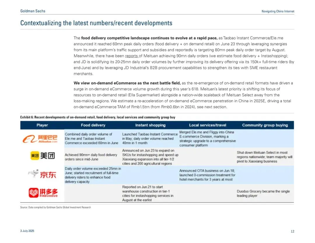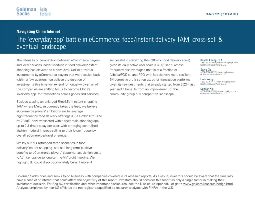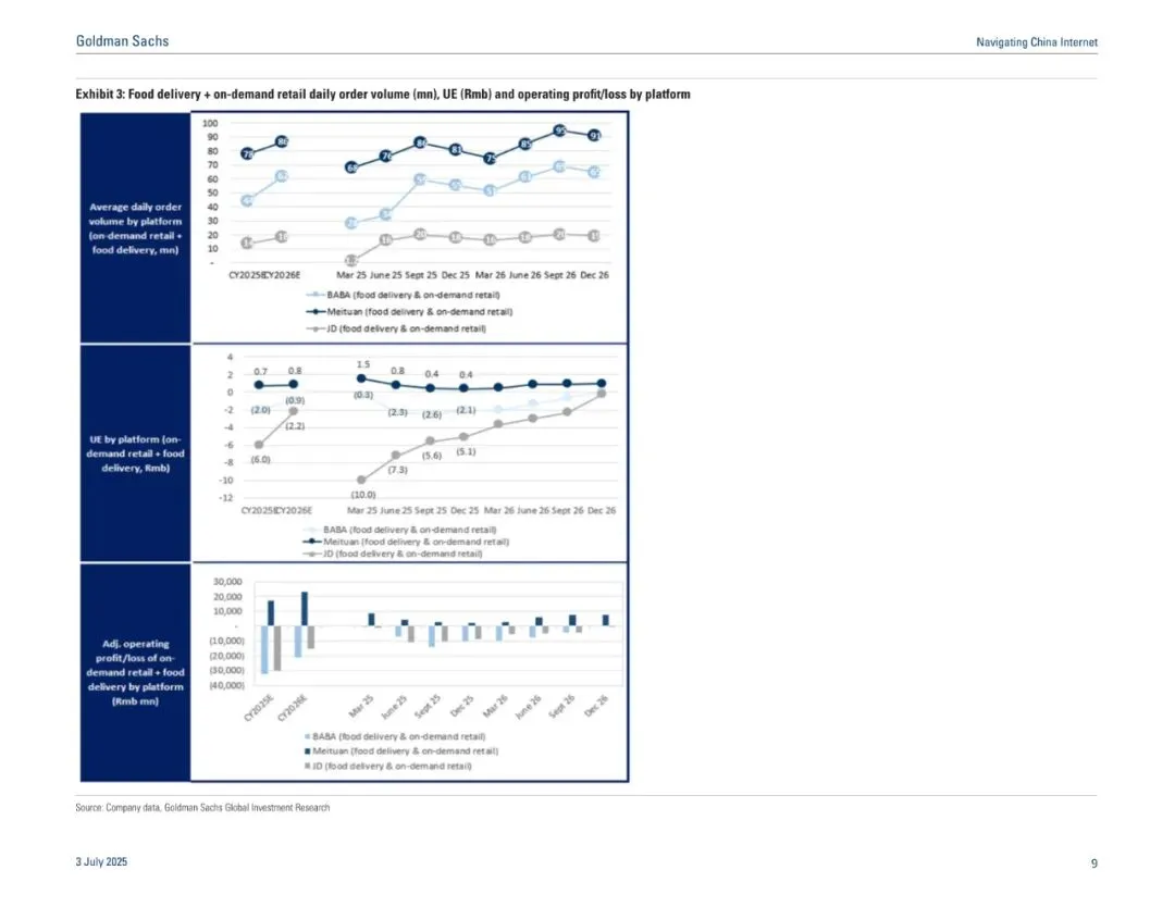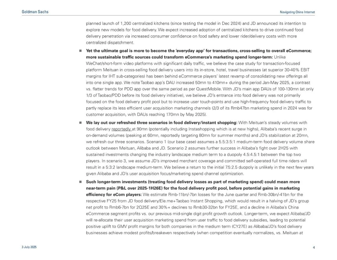 高盛强调,外卖大战的核心目标并非业务盈利,而是争夺用户高频入口。美团已验证该模式成功:通过外卖用户向到店、酒店、旅游等低频业务导流,实现30%-40%的EBIT利润率。阿里、京东正复制这一路径——阿里将饿了么、飞猪并入淘宝天猫集团,京东计划通过外卖业务提升日活用户至2000万以上,为3C、家电等品类交叉销售铺路。