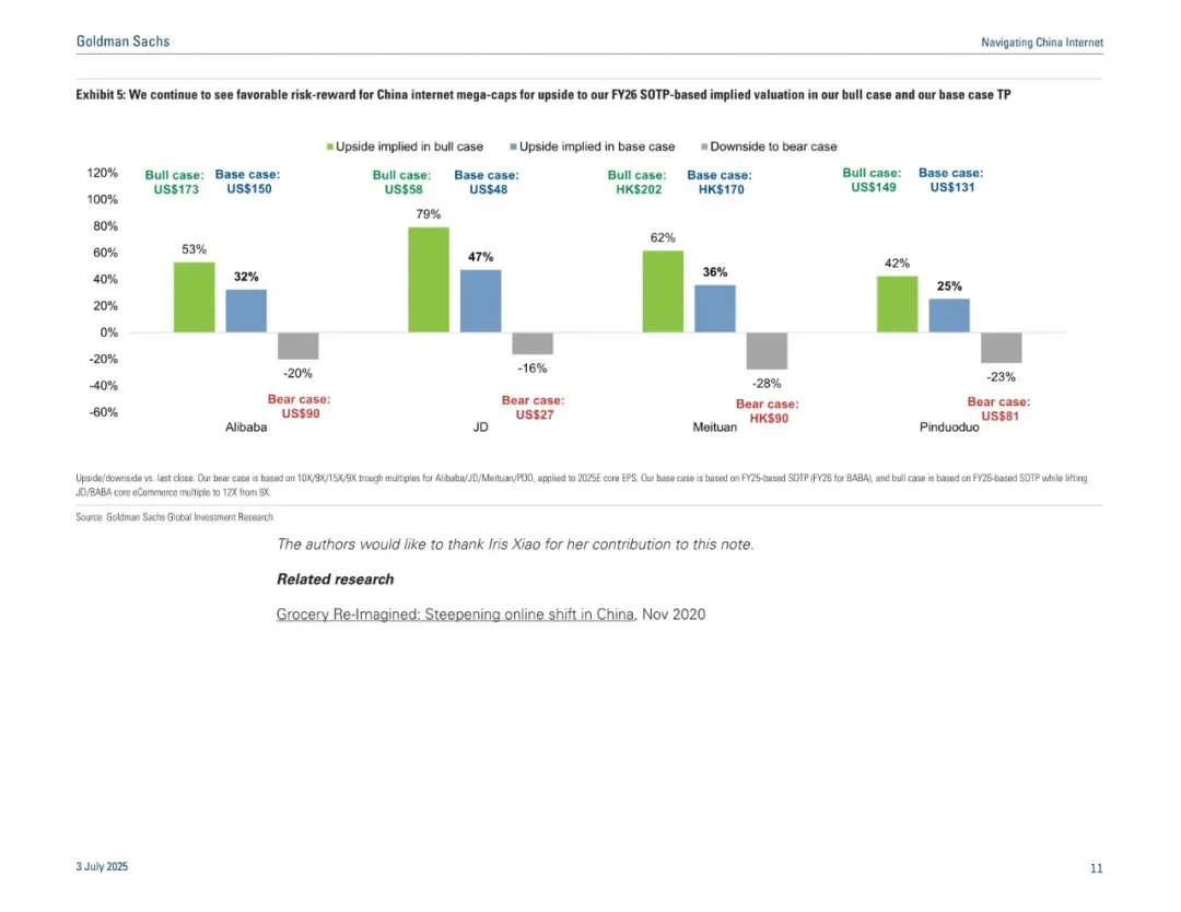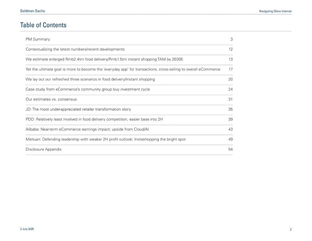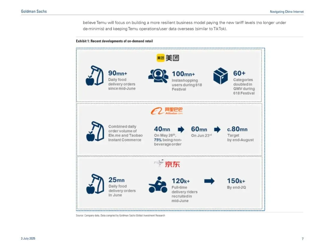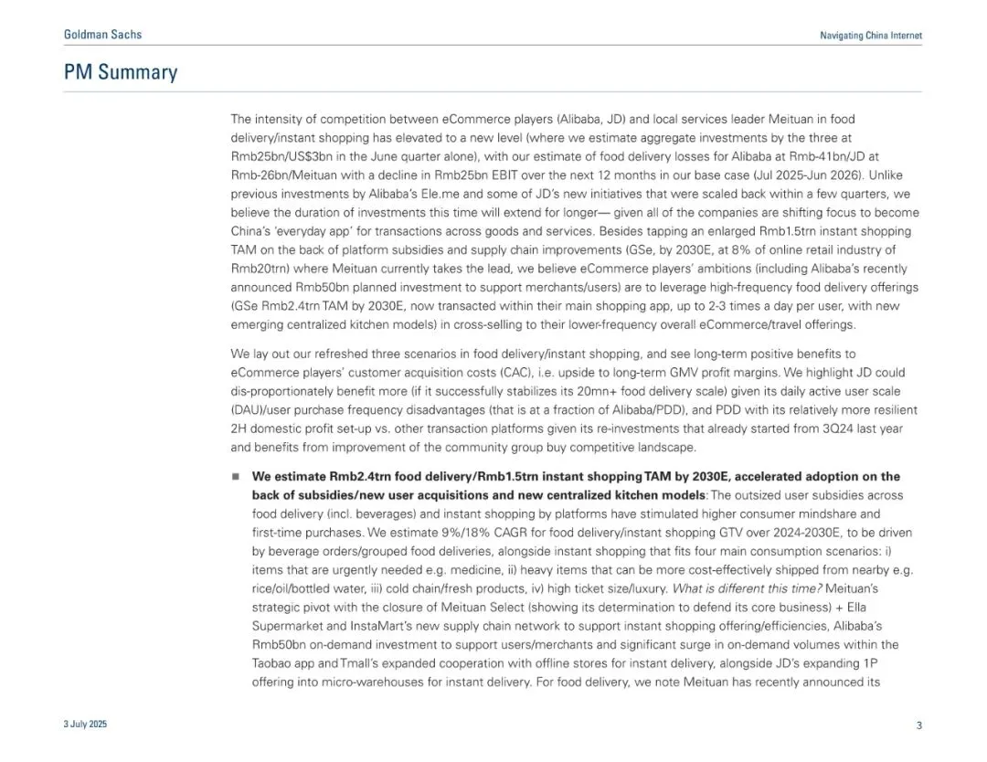 高盛强调,外卖大战的核心目标并非业务盈利,而是争夺用户高频入口。美团已验证该模式成功:通过外卖用户向到店、酒店、旅游等低频业务导流,实现30%-40%的EBIT利润率。阿里、京东正复制这一路径——阿里将饿了么、飞猪并入淘宝天猫集团,京东计划通过外卖业务提升日活用户至2000万以上,为3C、家电等品类交叉销售铺路。